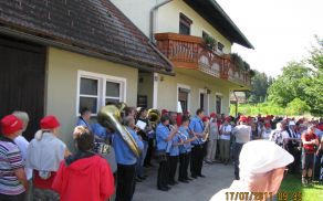 Po uradnem delu je sledilo krajše prijetno druženje z našimi koroškimi brati, s katerimi smo pokramljali o Slovencih in njihovi pripadnosti domovini v teh krajih. Zanimivo, da je npr. v letu 1951 bilo na Komlju 100 % slovenskega prebivalstva, prav tako v nekaterih bližnjih naseljih: Belšak, Breg, Grablje, Rinkole in Senčni kraj.