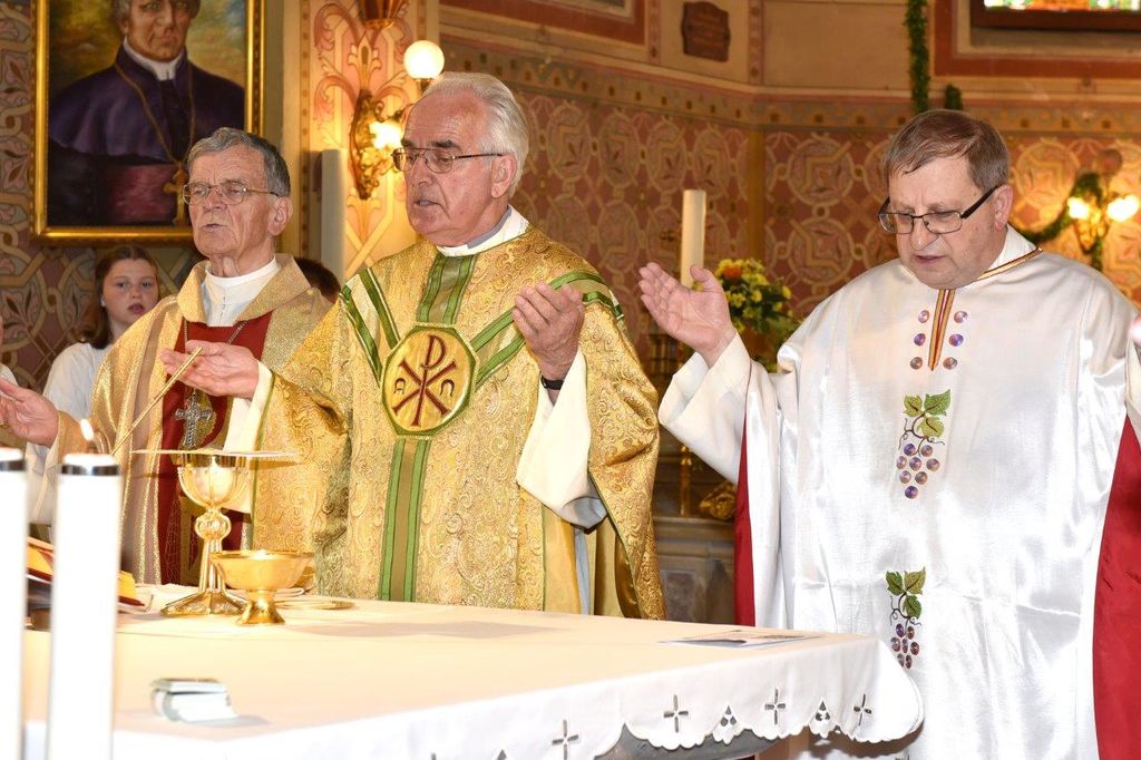 Ob 10. uri se je začela slovesna sveta maša, pri kateri so poleg jubilanta sodelovali vojniški rojaki, in sicer škof dr. Stanislav Lipovšek, dr. Bogdan Kolar, vojaški vikar Matej Jakopič, Ivan Šelih ter mariborski generalni vikar Janez Lesnika, dekan Alojz Vicman, Stanko Domajnko in Franc Brecl. Spremljali so jih številni ministranti. Na začetku je zlatomašnika v imenu farnega občestva pozdravil Karli Brezovšek. Pri slovesni maši je pel združeni pevski zbor, sestavljen iz pevcev mešanega cerkvenega pevskega zbora sv. Jerneja in Mešanega zbora Forte ob orgelski spremljavi prof. Tomaža Marčiča ter instrumentalistov Filipa in Erika Brezovška, Tomaža Adamiča, Miha Pesana in Gregorja Gubenška. Čudovito petje in igranje je ustvarilo vtis, kot da se vse to dogaja v veliki koncertni dvorani. Kot da so se nad Vojnikom odprla rajska vrata! Slovesni pridigar dr. Stanislav Lipovšek je čestital slavljencu in orisal njegovo življenjsko pot.
