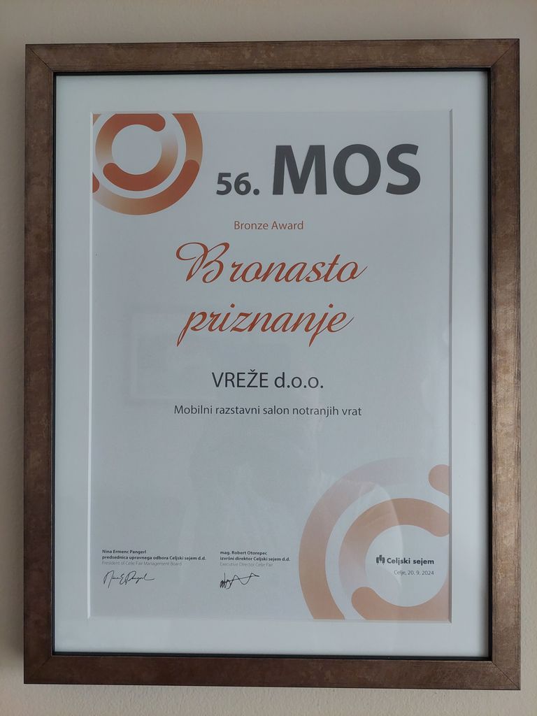 Na letošnjem 56. MOS-u se je podjetje predstavilo s svojim mobilnim razstavnim salonom. Za inovativnost pri prodaji, prihranek časa kupcem in zmanjšanje stroškov podjetja je podjetje Vreže, d. o. o., prejelo bronasto priznanje. Poleg MOS-a v Celju, Kmetijsko obrtnega sejma v Komendi in sejma Dom v Ljubljani se podjetje promovira preko jumbo plakatov ter spletne strani www.vreze.si. Za vse dodatne informacije pa so dosegljivi na tel: 070 15 07 04 ali e-naslovu: info@vreze.si. Želijo si, da bi z novim prodajnim pristopom dvignili nivo ponudbe notranjih vrat, prodajo pa bi radi razširili po vseh slovenskih regijah.