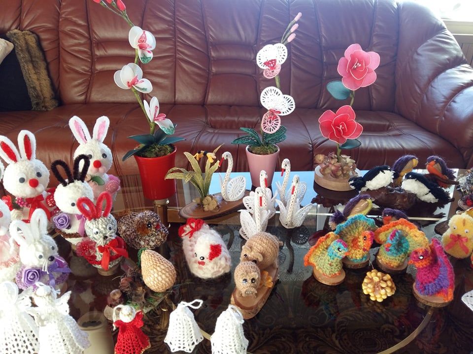 Ideje se porajajo same od sebe. Pošali se, da ima čip v glavi. Pod okriljem njenih rok je nastalo že ogromno čudovitih izdelkov glede na letni čas in različne praznike. Ko sem jo obiskala na domu, se kar nisem mogla načuditi raznoliki paleti izdelkov. Pokazala mi je kvačkane rože s srčki, zajce, kokoši, jajca, račke, košare z različnim cvetjem, kvačkano tihožitje sadja, ptičke, labode, lastovice, snežake, angelčke, zvončke, zvezdice in ogromno prtičkov in prtov, ki jih kvačka skozi vse leto.