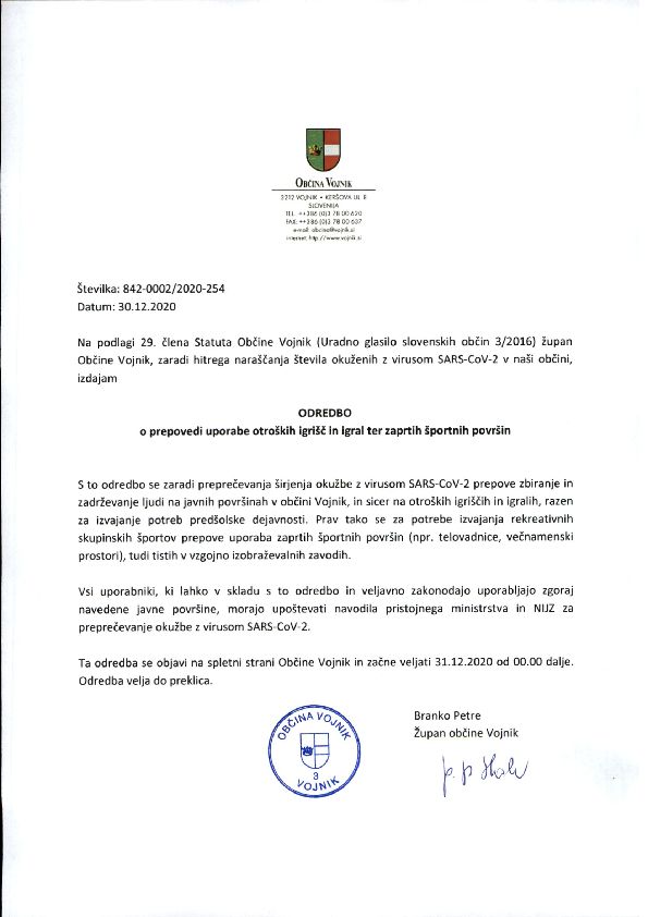 ODREDBA o prepovedi uporabe otroških igrišč in igral ter zaprtih športnih površin