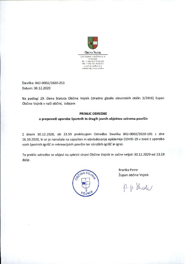 PREKLIC ODREDBE o prepovedi uporabe športnih in drugih javnih objektov oziroma površin