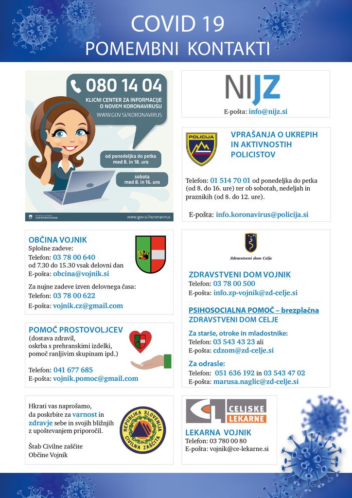 7.)  Občinska uprava je pripravila nabor pomembnih številk za obdobje COVID-a 19, ki so se objavile na spletni strani Občine Vojnik in tudi v novembrski številki Ogledala (Klicni center 080 14 04, Policija, Občina Vojnik – splošne zadeve ter pomoč prostovoljcev, Lekarna Vojnik, Zdravstveni dom Vojnik in brezplačna psihosocialna pomoč.)