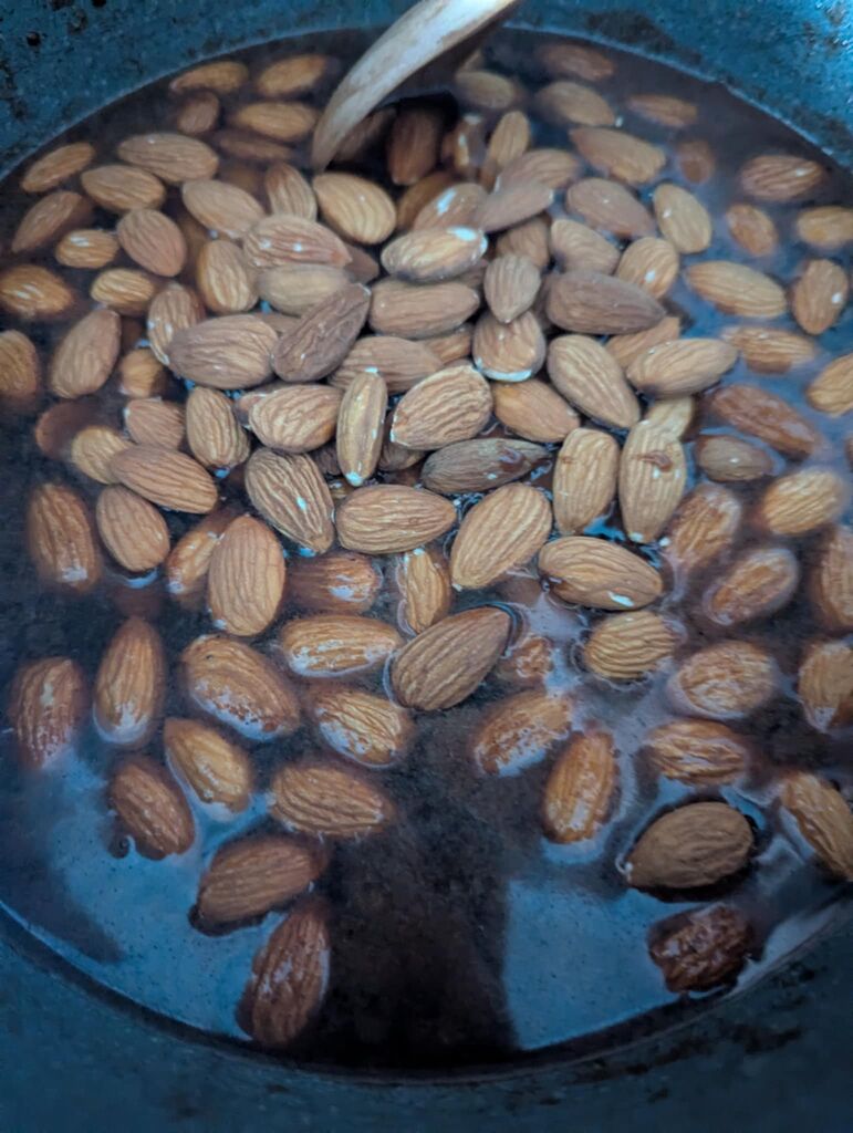 - Preden so drevo mandljevca udomačili, je to uspevalo kot divje drevo. Plodovi mandljevca so tako morali biti obdelani s praženjem, saj v divji obliki vsebujejo toksine, ki so jih s praženjem odstranili in jih nato uporabili v kulinariki.