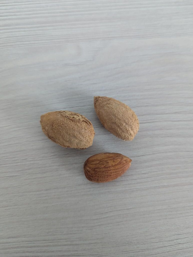 - Nekateri jedo tudi mlad sadež mandlja, ko je ta še zelen in še nima trde lupine. Takšen videz ima mandelj od sredine aprila pa vse do junija.