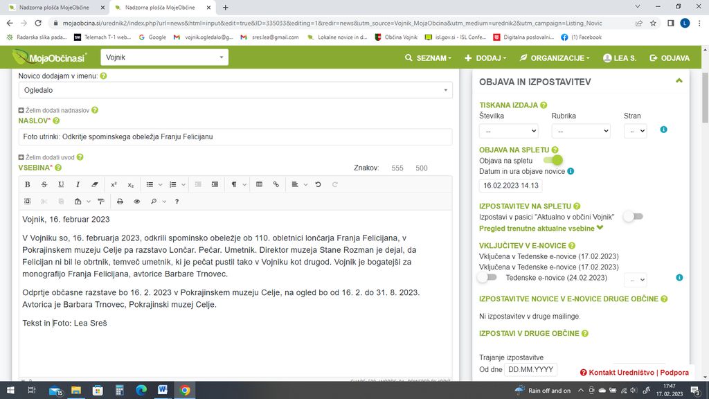 V Vojniku so, 16. februarja 2023, odkrili spominsko obeležje ob 110. obletnici lončarja Franja Felicijana, v Pokrajinskem muzeju Celje pa razstavo Lončar. Pečar. Umetnik. Direktor muzeja Stane Rozman je dejal, da Felicijan ni bil le obrtnik, temveč umetnik, ki je pečat pustil tako v Vojniku kot drugod. Vojnik je bogatejši za monografijo Franja Felicijana, avtorice Barbare Trnovec.