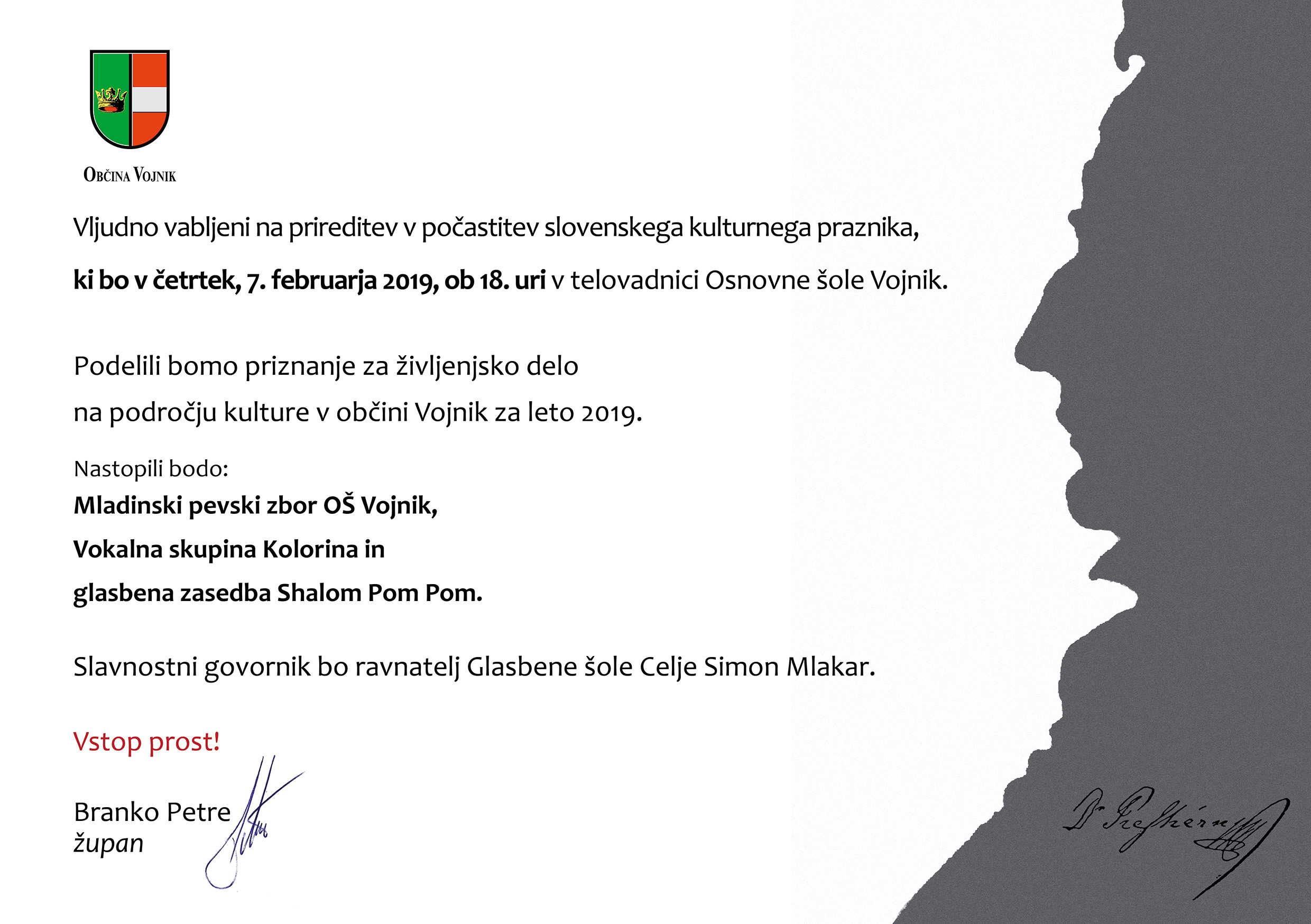 Vljudno vabljeni na prireditev v počastitev slovenskega kulturnega praznika,