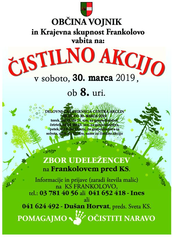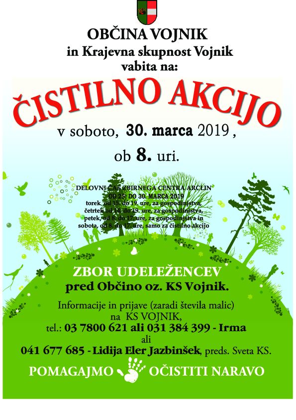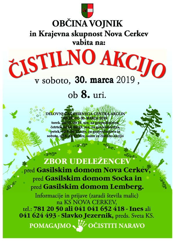 Kot že veste, bo letošnja čistilna akcija za društva in posameznike, ki čistijo središča krajev in tam, kjer je pač treba, potekala v soboto, 30. marca 2019, z začetkom ob 8. uri, v primeru slabega vremena se prestavi na naslednjo soboto, 6. aprila 2019.