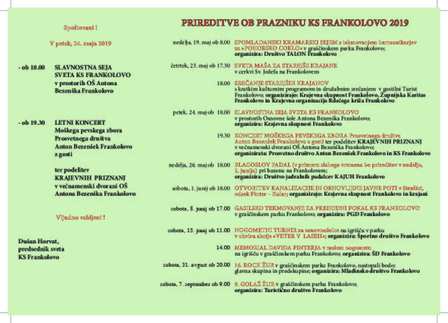 Vabljeni na vse prireditve ob prazniku KS Frankolovo.