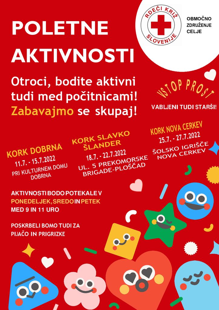 Območno združenje Rdečega križa Slovenije in KO RK Nova Cerkev vabita na Poletne aktivnosti v času od 25. julija 2022 do 27. julija 2022 na šolskem igrišču pri POŠ Nova Cerkev. Aktivnosti bodo potekale v ponedeljek, sredo in petek med 9. in 11. uro.