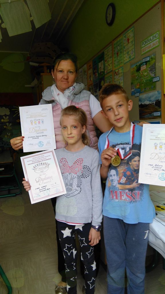 Na mednarodnem likovnem natečaju v Turčiji, ki ga organizira Mizyal Gallery Museum, sta tretješolca Jaka Božnik in Staša Markič dosegla izjemen uspeh. Na natečaj je prispelo 6500 likovnih del iz 18 držav z vsega sveta. Jaka Božnik je v kategoriji od 4 do 12 let usvojil zlato priznanje, poleg priznanja je prejel tudi zlato medaljo. Risba Staše Markič je bila izbrana v posebni kategoriji likovnih del, ki bodo krasila otroško galerijo. Vsi smo bili zelo veseli pošte, ki je prispela iz Turčije, v kateri so bila priznanja in medalja. To je odlična spodbuda za nadaljnje delo, ustvarjalnost in iskanje novih idej, ki jih otrokom nikoli ne zmanjka.
