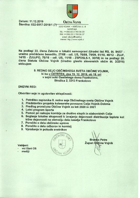 9. redna seja Občinskega sveta Občine Vojnik bo v četrtek, 19. 12. 2019, ob 18, uri, v sejni sobi Gasilskega doma Frankolovo.