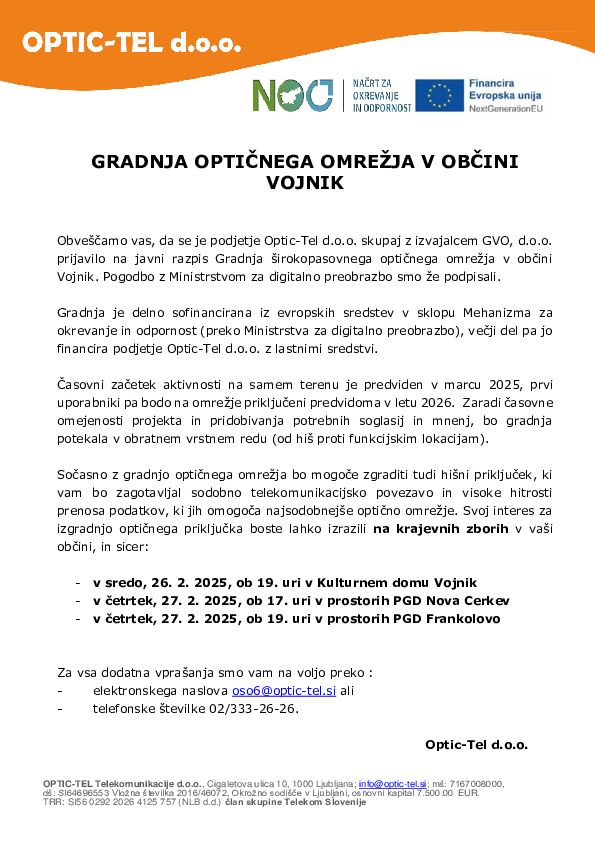 Obveščamo vas, da se je podjetje Optic-Tel d.o.o. skupaj z izvajalcem GVO, d.o.o. prijavilo na javni razpis Gradnja širokopasovnega optičnega omrežja v občini Vojnik. Pogodbo z Ministrstvom za digitalno preobrazbo smo že podpisali.