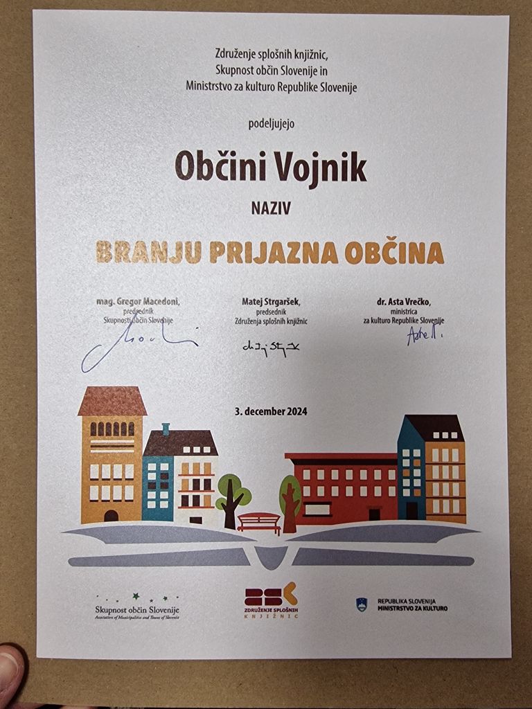 Občina Vojnik je, 3. decembra 2024, na ta veseli dan kulture na Ministrstvu za kulturo prejela certifikat Branju prijazna občina. Tako smo se pridružili 69 ostalim občinam, ki se že ponašajo s tem nazivom. Certifikat je g. županu Branku Petretu predal Matej Strgaršek, predsednik Združenja splošnih knjižnic.