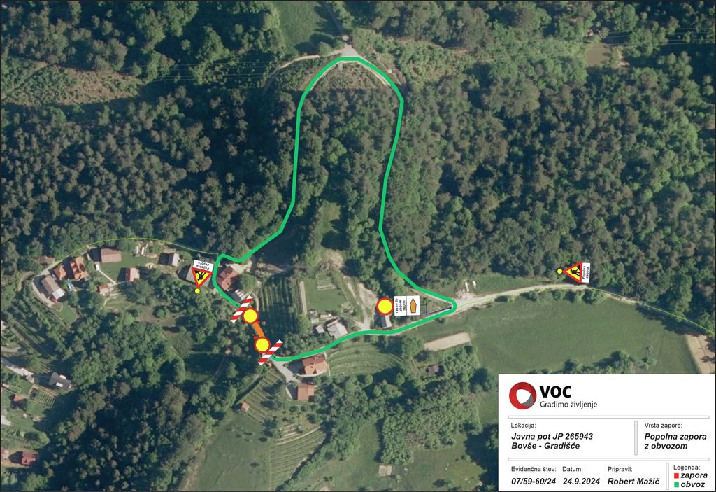 Obveščamo vas, da se popolna zapora občinske javne poti JP 965243 »Bovše 8 – Gradišče 3c«, zaradi gradnje transformatorske postaje Gradišče podaljša do 30. 11. 2024, za čas del oziroma med 7.00 in 17.00. Zapora se po končanem delu dnevno sprosti. V času popolne zapore bo obvoz mogoč po vzporednih cestah.