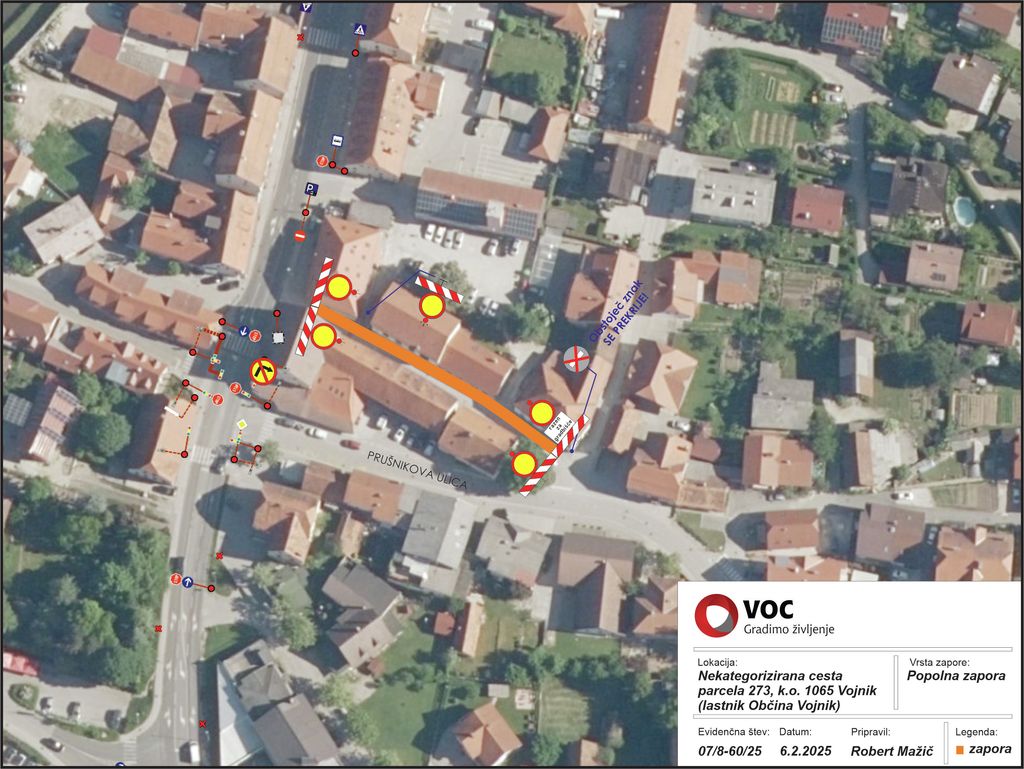Obveščamo vas, da bo od 06. februarja do 31. maja 2025 popolna zapora nekategorizirane ceste, ki poteka po parceli št. 273, k.o. 1065 – Vojnik trg, v lasti Občine Vojnik (označeno na priloženi fotografiji), zaradi izvedbe projekta »Sanacija Prušnikove ulice z obnovo vodovoda«. Za čas popolne zapore bo obvoz mogoč po vzporednih cestah.