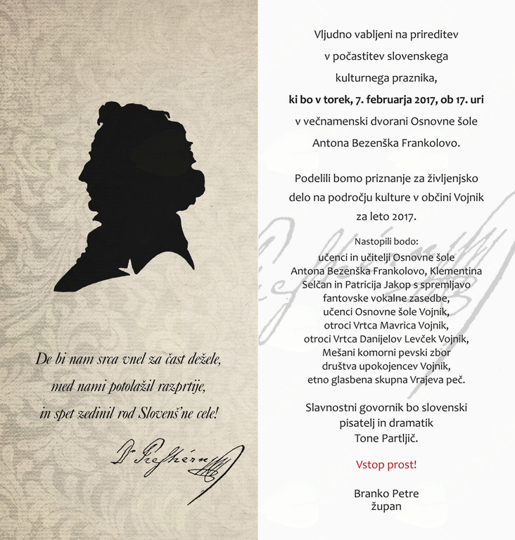 Vljudno vabljeni na prireditev v počastitev slovenskega kulturnega praznika,