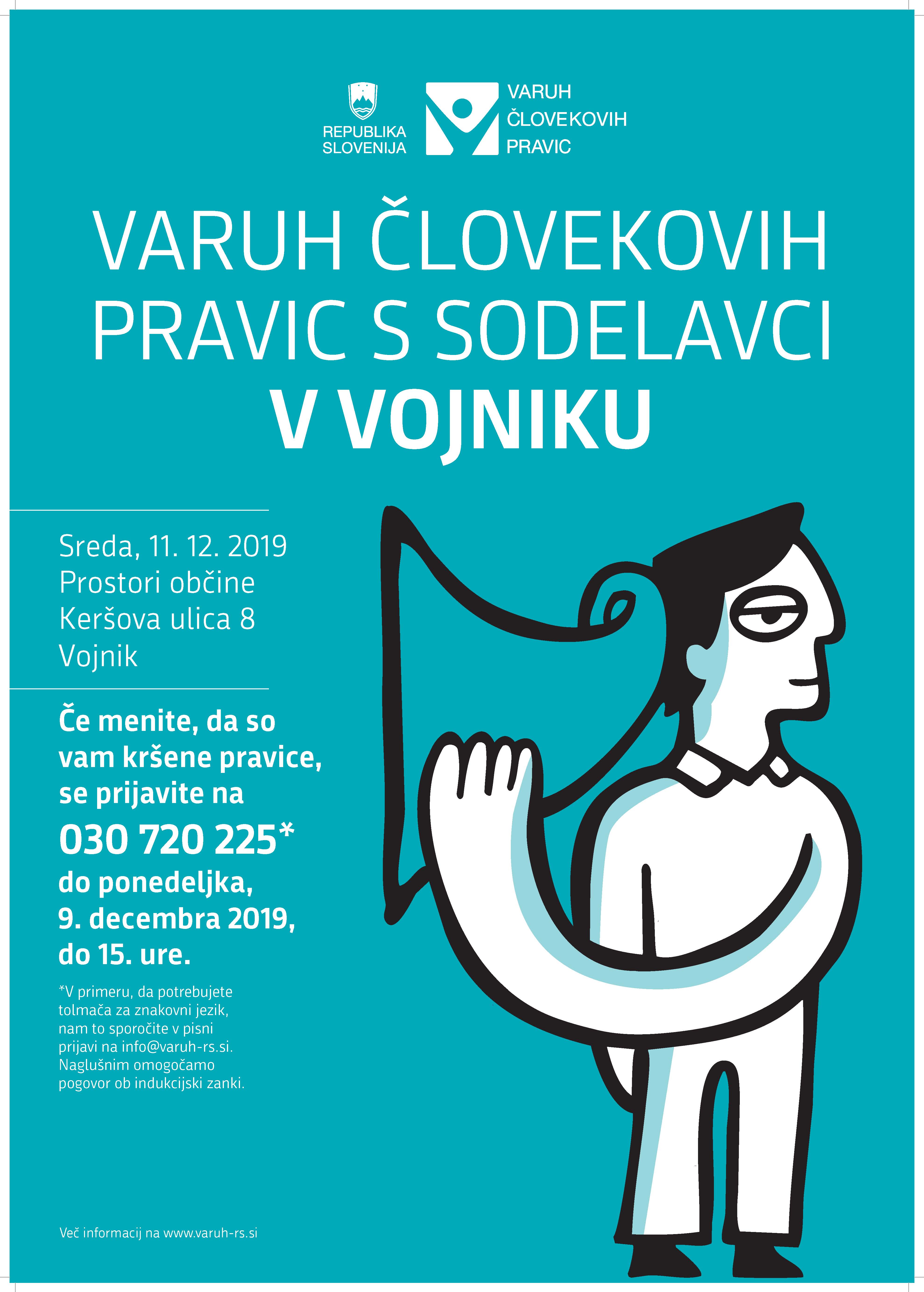 Vsi, ki menijo, da so jim kršene pravice in bi jim lahko varuh s sodelavci pomagal, lahko pokličejo na telefonsko številko 030 720 225. To lahko storijo najkasneje do ponedeljka, 9. 12. 2019, do 15. ure in se naročijo na polurni pogovor. Pogovori bodo potekali v prostorih občine na naslovu Keršova ulica 8 v Vojniku.