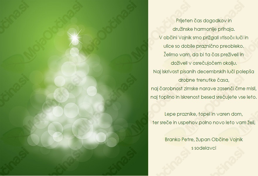 Spoštovani sokrajani, pred nami je praznični božično-novoletni čas. Narava okoli nas se je že umirila in to je priložnost tudi za nas. Naj vas povabim na prireditev »Županov sprejem«, kjer vam bom lahko tudi osebno segel v roko in zaželel vse dobro v letu, ki prihaja. V Vojniku se nam obeta prava praznična poslastica. Pod vodstvom Turističnega društva Vojnik, v sodelovanju krajanov in občine je nastal projekt z naslovom »Božični Vojnik«. Menim, da je to eden najboljših projektov v zadnjem času, saj povezuje delo skoraj vseh društev in organizacij v našem kraju. Pridite in si oglejte razstavo jaslic, udeležite se dogodkov, posladkajte se z božičnimi dobrotami, spočijte si dušo in telo, pripeljite otroke, povabite prijatelje … skratka, imejmo se praznično!