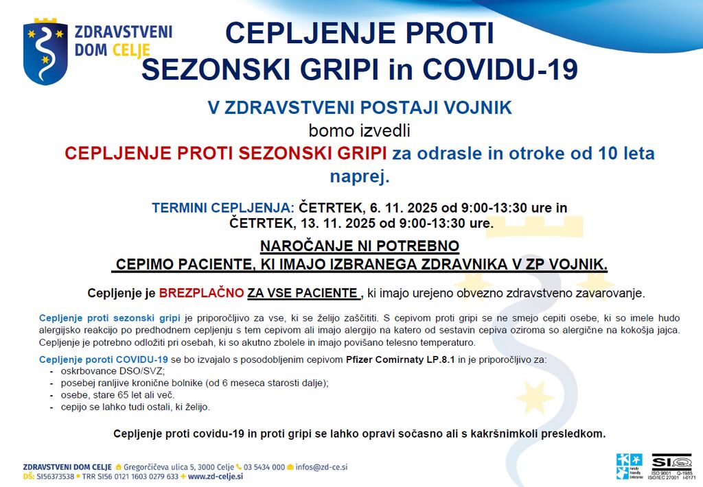 V ZDRAVSTVENI POSTAJI VOJNIK bomo izvedli CEPLJENJE PROTI SEZONSKI GRIPI za odrasle in otroke od 10 leta naprej.