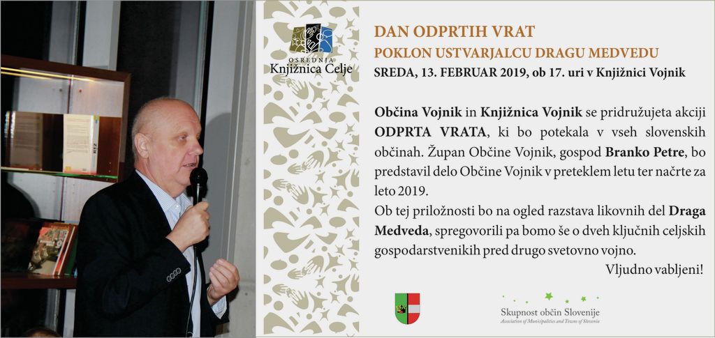 Občina Vojnik in Knjižnica Vojnik se pridružujeta akciji odprta vrata, ki bo potekala v vseh slovenskih občinah. Župan Občine Vojnik, gospod Branko Petre, bo predstavil delo Občine Vojnik v preteklem letu ter načrte za leto 2019. Ob tej priložnosti bo na ogled razstava likovnih del Draga Medveda, spregovorili pa bomo še o dveh ključnih celjskih gospodarstvenikih pred drugo svetovno vojno.