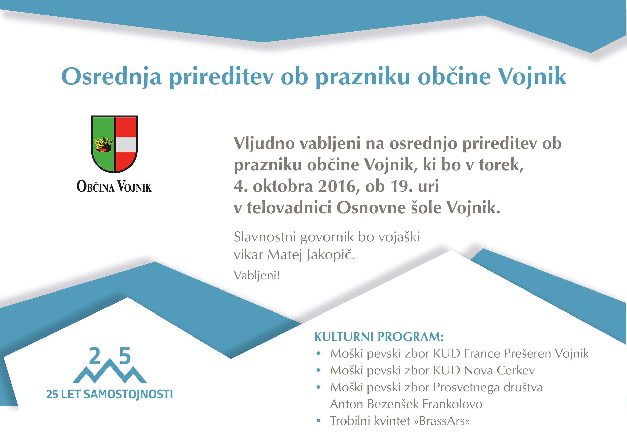 Vljudno vabljeni na osrednjo prireditev ob prazniku občine Vojnik, ki bo v torek, 4. oktobra 2016, ob 19. uri v telovadnici Osnovne šole Vojnik.