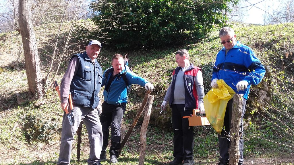 Bojan, Damjana, Zdravko, Vili in Franci so se spoprijeli s hribom pod Kočo; Irena, Zvonka in Peter so z grabljami in škarjami začeli nad Kočo, Lojze je pregledal žarnice, Ivan je skrbel za ogenj … Ker pa smo ta dan gostili še planince PD Šentjur, je Danica pripravila jedilnico, Zdenko je priskrbel za malico. Tomaž je veselo druščino pripeljal po Modrijanovi poti h Koči, kjer so si vzeli čas za daljši postanek. Sonja in Minka sta po slabi uri prispeli po eni izmed poti iz Vojnika in zadovoljni ugotavljali, da je vsako leto manj odpadkov. Pridružili sta se delu pri Koči. Malo kasneje so z drugih poti prišli še Vojko, Jože in Franc. V črnih vrečkah ni bilo dosti smeti. Vključili so se k zaključnim delom pri škarpi. Okolico cerkve je pregledal Stanislav. V njegovi črni vrečki je bilo še manj smeti. Z markiranih poti so se nam priključili še markacisti Rajko (novi načelnik markacistov), Uroš, Andrej in Darko. Bili so še polni elana in idej!