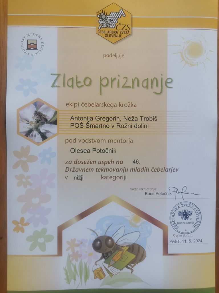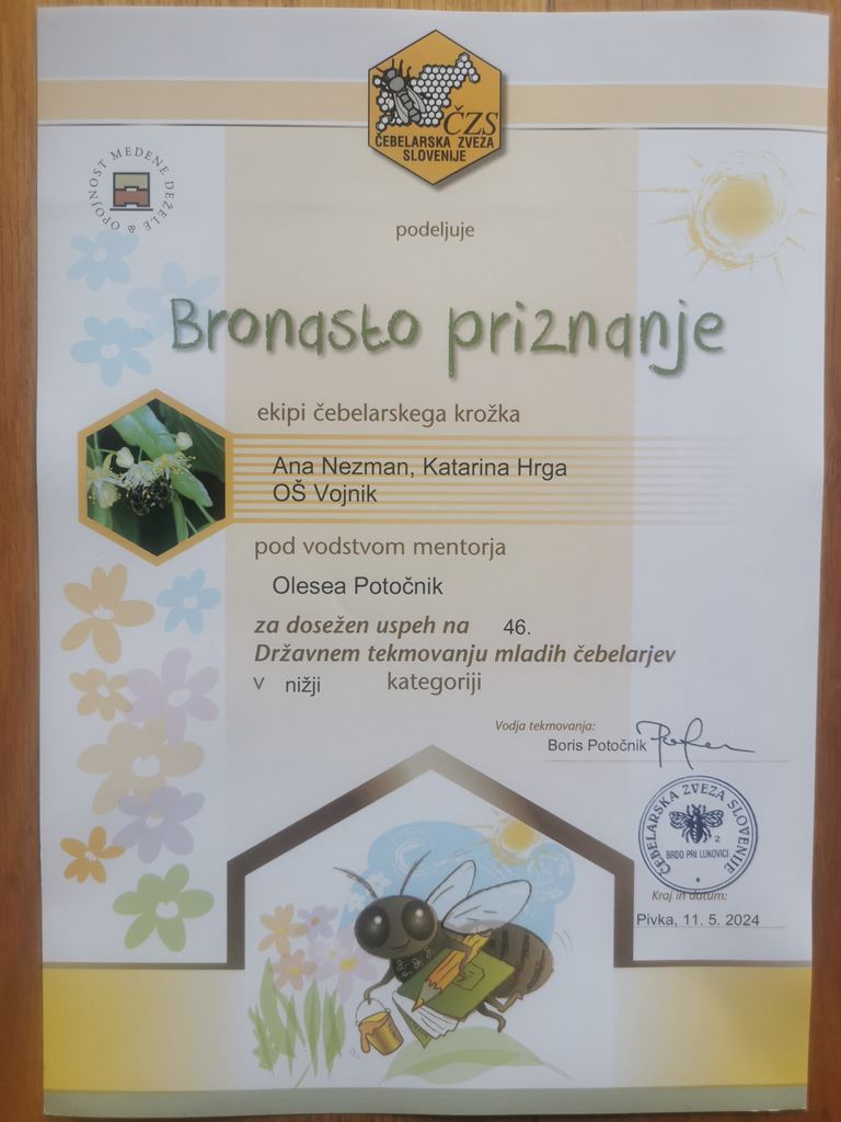 Čebelarsko društvo Vojnik se zahvaljuje mentorici Olesei Potočnik za skrbna predavanja na čebelarskih krožkih, ki jih vodi in za dosežene rezultate njenih varovancev. Hvala!
