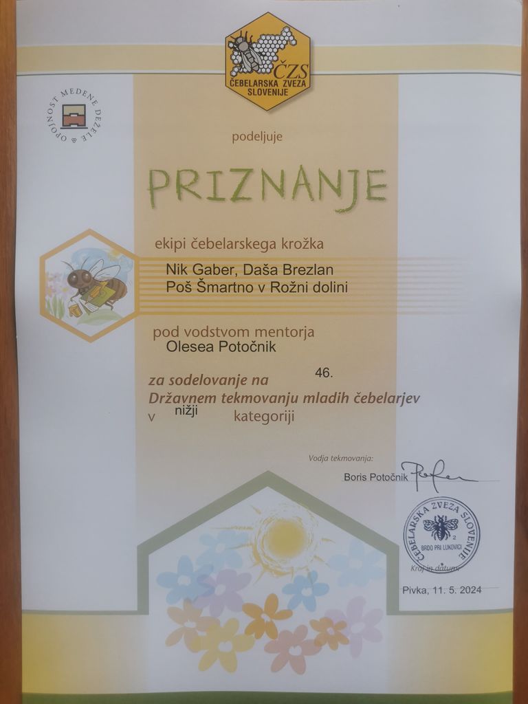 Prav tako hvala ravnateljem osnovnih šol, ki omogočajo v svojih prostorih izvajanje čebelarskih krožkov in hvala Lidiji Eler Jazbinšek za organizacijo prevoza.