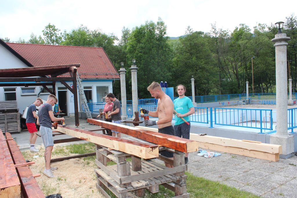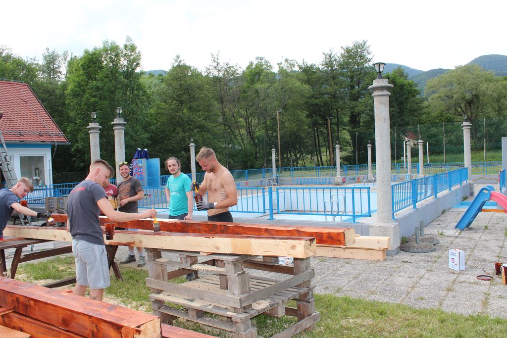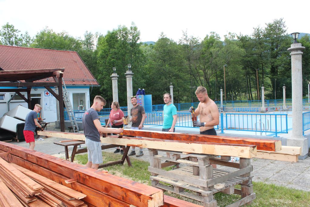 Bliža se poletna sezona kopanja. Skupino mladih iz Frankolovega sem ujela pri urejanju okolice bazena, postavljali so nadstrešek, ki bo izboljšal pogoje dela ob vročih poletnih dneh.