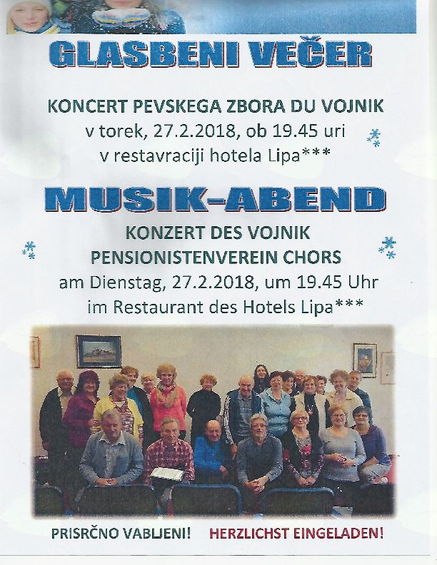 Terme Lendava so nam ponudile najugodnejši aranžma. Tako smo se v ponedeljek, 26. 2. 2018, z avtobusom odpeljali v Lendavo do hotela Lipa. Prevoz z osebnimi avtomobili žal ni bil mogoč, saj je ravno takrat pritisnil hud mraz z obilo snega. V hotelu smo imeli na izbiro več dvoran in drugih prostorov za izvajanje svojega programa. Namestili smo se po dvoposteljnih sobah in takoj začeli vaje. Pevske vaje je vodila zborovodkinja Katja Klinc, pomagala pa sta korepetitorka Anja Zdolšek in Marjan Čretnik. Z vajami smo nadaljevali še v torek, končali pa v sredo z dobrim kosilom.