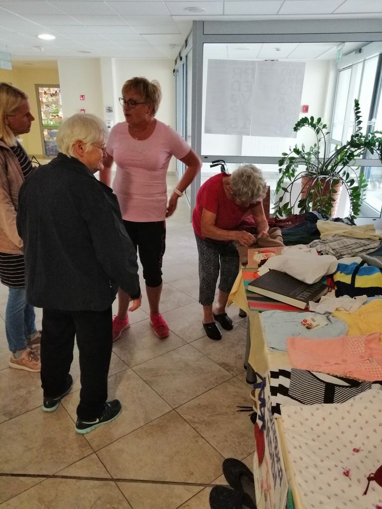 V pisarni našega društva so se pridno nabirale zelo lepe in uporabne stvari. Podarjene smo dobili tehnične pripomočke, ki jih člani niso več potrebovali. Z veseljem nam je župan občine Štore dodelil prostor, ki smo ga poimenovali kar shrambica. Dobre stvari se širijo iz ust do ust in danes je naša shrambica kraj, kjer hranimo lepe in uporabne stvari. Ljudje prihajajo sem posamezno, si stvari ogledajo in brez kakršnih koli dokazil lahko dobijo, kar jim pride prav. Za urejenost shrambice skrbi naša Verica. Odločili sva se, da v shrambico povabimo uporabnike Doma Lipa iz Štor. Z njimi smo se družili in vsak varovanec je našel nekaj koristnega zase. Ker je bilo druženje zanimivo, sva se odločili, da s sodelovanjem delavcev v Domu Lipa postavimo stojnico in povabimo težje gibljive varovance. Z veseljem so se udeležili druženja in na stojnici je vsak našel nekaj zase. Ob pogovoru o časih, ko so bili doma ter kako živijo danes, in med obdaritvijo se je utrnila marsikatera solza. Varovanci kar niso mogli verjeti, da si lahko izberejo stvari brez plačila.