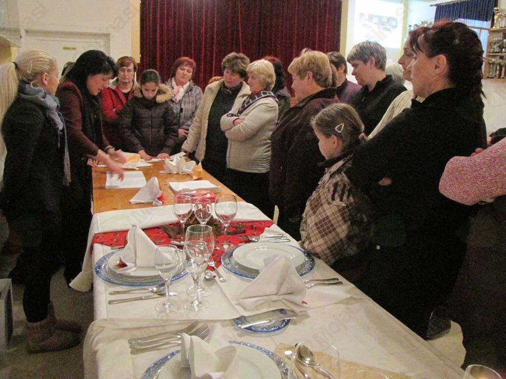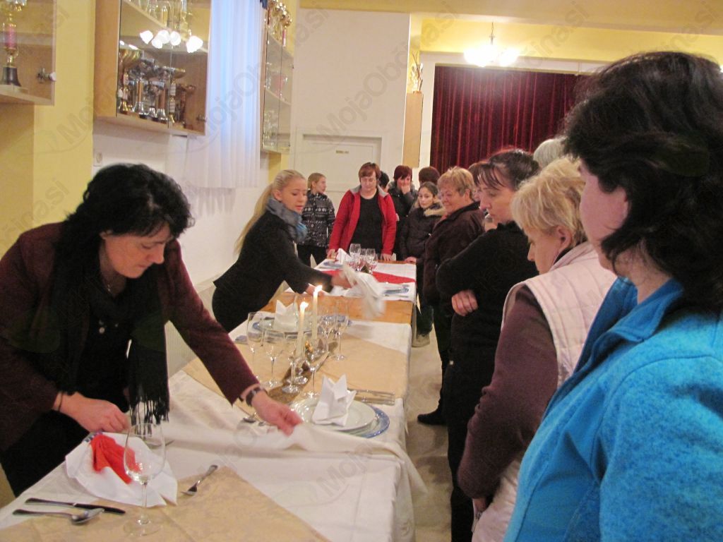 Delavnico je vodila Cecilija Božnik, pomagala pa ji je Megi Medved, uspešna dijakinja Srednje šole za gostinstvo in turizem Celje. Najprej sta predstavili nekaj osnovnih zakonitosti pogrinjka, nato pa praktično prikazali tri vrste pogrinjkov. Članice smo se naučile nekaj načinov zlaganja prtičkov, kar bo prav gotovo prišlo v tem času zelo prav. Ugotovile smo, da se da mizo lepo pripraviti na zelo enostaven način, le malo idej je potrebnih.