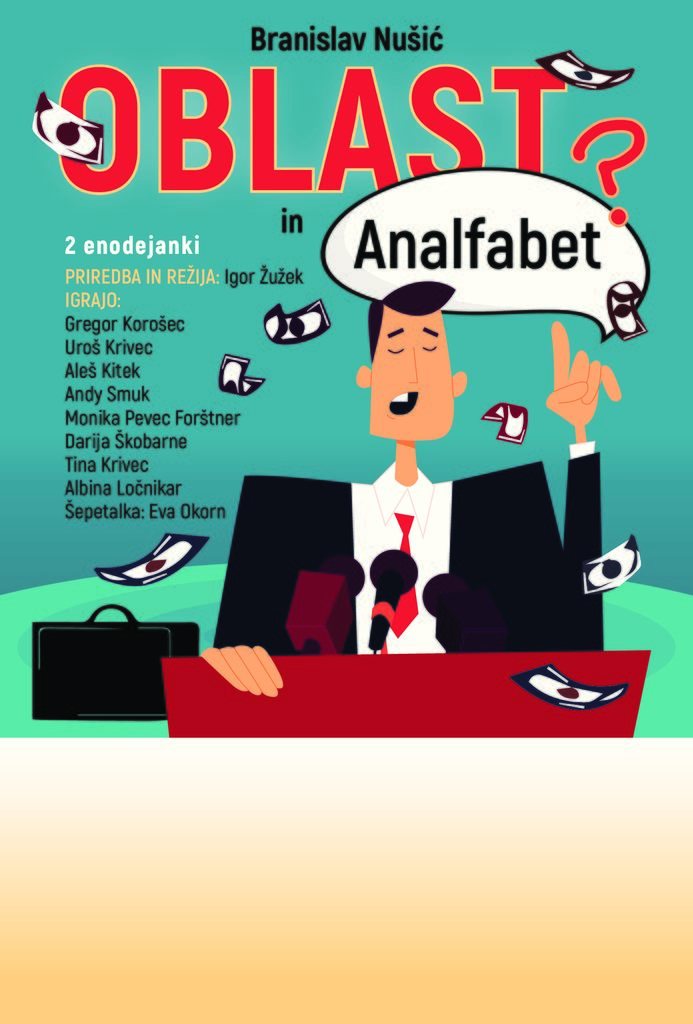 Čeprav je Branislav Nušić pisal situacijsko komedijo v enem dejanju, Oblast leta 1938, je za današnjega gledalca in soustvarjalca sodobne družbe še kako aktualna. Politika ima v vseh obdobjih enake zakonitosti. Tisti, ki je na oblasti, je privilegiran in ima zato moč zaščititi sebe in svoje. Avtor v njej na slikovit način opisuje, korupcijo, lopovščino in pohlep oblastnikov. Igra govori o družini, ki se ji je posrečilo, da je neki njen član postal minister in to takoj povzroči pri bližnjem in daljnem sorodstvu velike ambicije, za svoje osebne koristi. Zato si kar naprej podajajo kljuko pri ministru doma in prinašajo s seboj prošnje, za katere so prepričani, da jim jih bo minister zlahka uslišal. A minister gleda na svoje sorodnike z višine. Pri naši predstavi ministra ne igra noben igralec. Je samo del drenjajoče se gruče ljudi, ki ga je obstopila in ga zasula s prošnjami. Obstaja samo njegova žena, ki pa je zelo vzvišena in ne misli delati uslug nikomur; razočaranje je pri navadnih ljudeh seveda zelo veliko. Zato je, na koncu igre, nujno potrebno razložiti ne samo občinstvu, temveč tudi domačim, kaj je pravzaprav to oblast in kako je videti od spodaj. To pa zelo zadovoljivo opravita stric Arsa in tast Miloje. Nušić je umrl prej, preden je lahko dokončal komedijo Oblast. Zato je konec nekoliko nejasen in prepuščen domišljiji režiserja, igralcev in gledalcev. V enodejanki Analfabet avtor opisuje eno od njegovih najvažnejših tem: prikazuje družbenopolitično oblast kot način življenja in omejeno razumevanje sveta okoli njih. Kajti oblastniki s svojo ne preveč pametno in domišljeno borbo za svoj lastni stolček, vedno globoko posežejo v družbo okoli sebe in jo razburkajo s svojim razumevanjem ukazov z vrha.