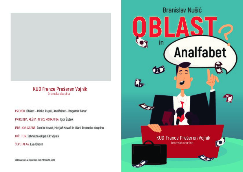 - Vabljeni na ogled predstave KUD France Prešeren Vojnik, dramska sekcija: premiera, Branislav Nušić, dve enodejanki Oblast, Analfabet v soboto, 6. aprila 2019, ob 19.30 v Kulturnem domu Vojnik.