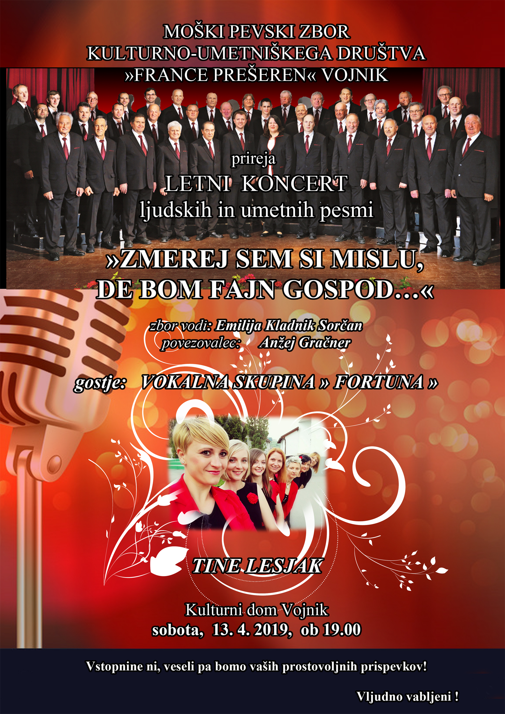 - Letni koncert Moškega pevskega zbora KUD France Prešeren Vojnik v soboto, 13. aprila 2019, ob 19.00 v Kulturnem domu Vojnik.