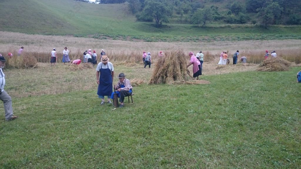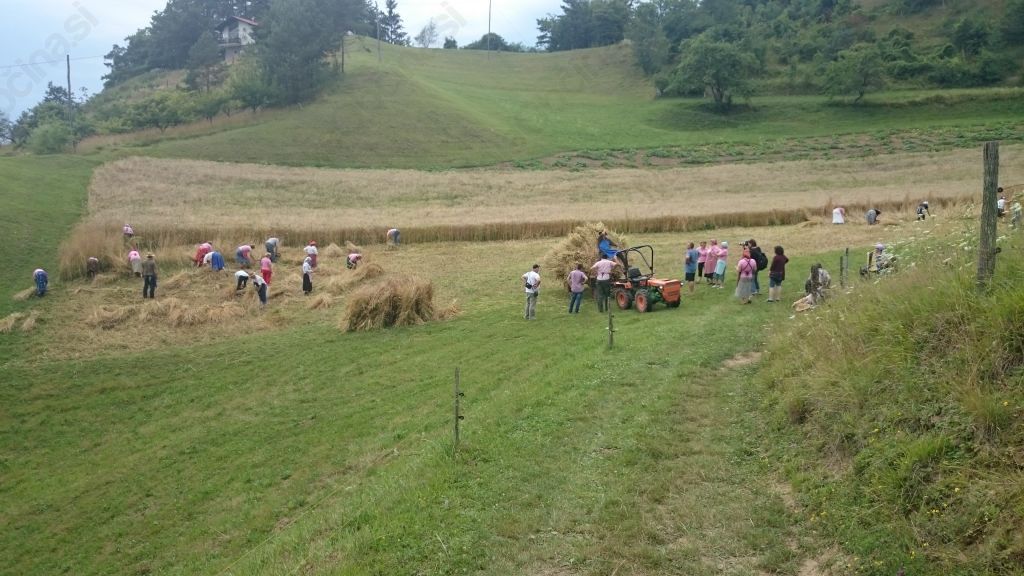 Na ponedeljkovo popoldne sredi julija se nas je kljub temnim oblakom na nebu zbrala vesela druščina starejših in mlajših članic, nekatere tudi s svojimi možmi in otroki. Mlajše, ki so to delo videle prvič, so malo opazovale starejše, nato pa so še same z veseljem poprijele za srpe in se naučile žeti. Najstarejša članica oz. žanjica je bila Terezija Smodej iz Šmartnega v Rožni dolini. Z velikim veseljem se je povabilu odzvala, poiskala med starim kmečkim orodjem srp, si ga sklepala in prišla na žetev. Žanjice so žele, nekatere smo tudi delale »poresle«, otroci so v košarice pobirali klasje, možje pa so jih pridno vezali v snope, zlagali v kopice, nato pa snope naložili na voz. Gospodar Marjan je s traktorjem vozil naloženo žito domov, kjer so ga moški zlagali v kozolec. Pri zlaganju v kozolec je treba paziti, da snopi niso preveč tesno drug poleg drugega in da je klasje obrnjeno na notranjo stran, saj je le tako zaščiteno pred vremenskimi vplivi. Silvo, 86-letni član družine Žerjav, je bil zadolžen, da so bili srpi dobro sklepani in nabrušeni, domača dekleta pa so poskrbela, da grla niso bila suha.