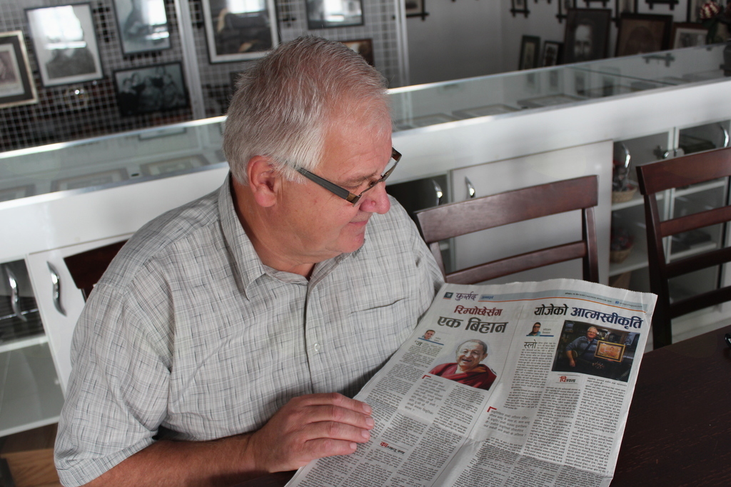 Pozimi je Galerijo Piros v Globočah obiskal nepalski novinar Chhabi Raman Silwal iz Kakmanduja, glavnega mesta Nepala. Življenje in delo Jožeta Žlausa je predstavil v dveh časopisih v Nepalu. Časopis, ki je izšel v mesecu februarju, se je na žalost nekje na poti izgubil, Jože Žlaus ga je prejel samo v elektronski obliki. Drugi časopis pa je prispel na naslov v Globoče. Glede na nepoznavanje nepalske pisave in jezika nam je pri prevajanju pomagal Birman Shrestho, ki je pred petimi leti prišel iz Nepala in si je v Celju ustvaril družino.
