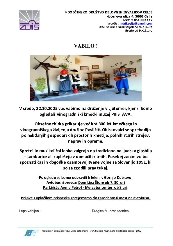 V sredo, 22.10.2025, vas vabimo na druženje v Ljutomer, kjer si bomo ogledali vinogradniški kmečki muzej PRISTAVA.