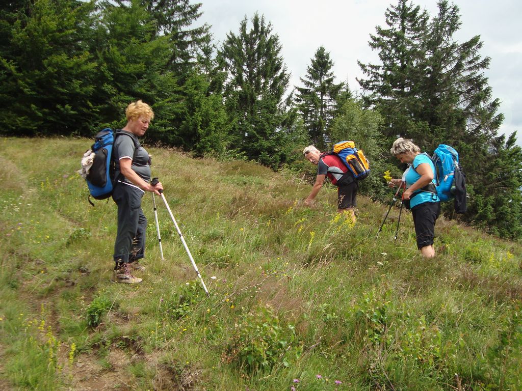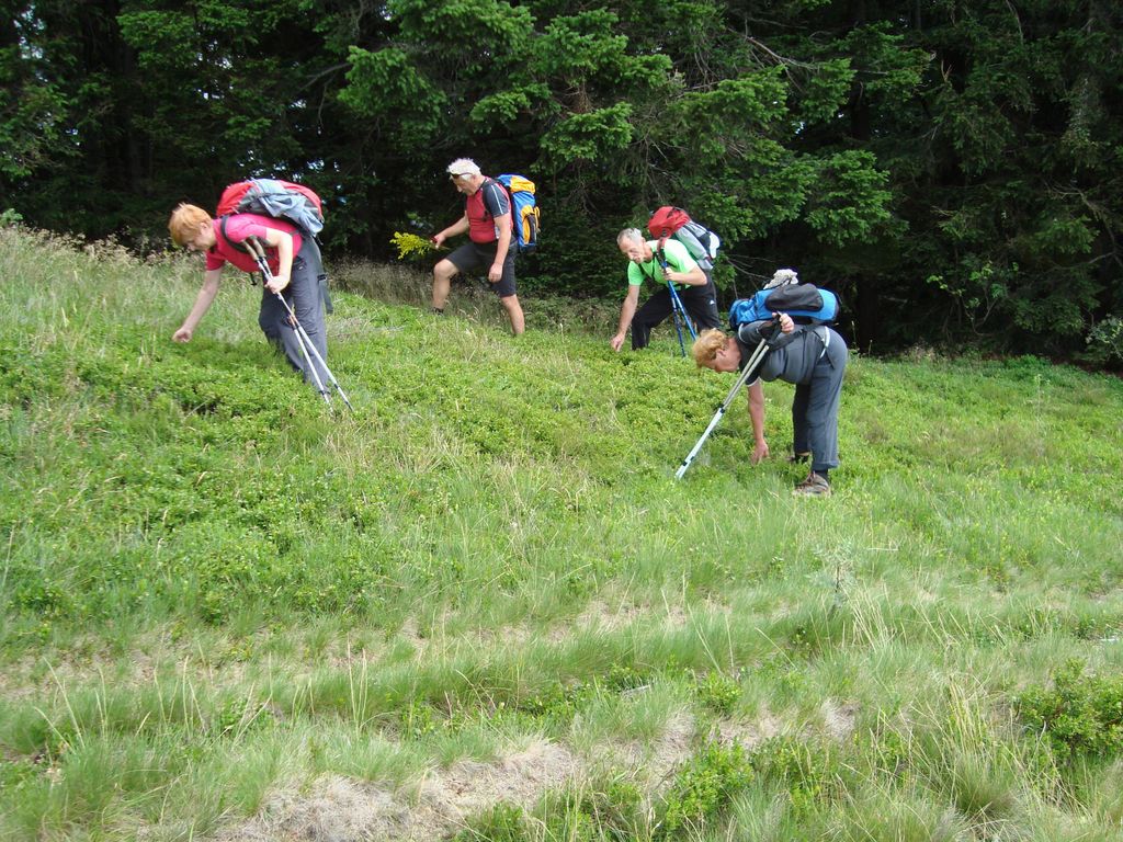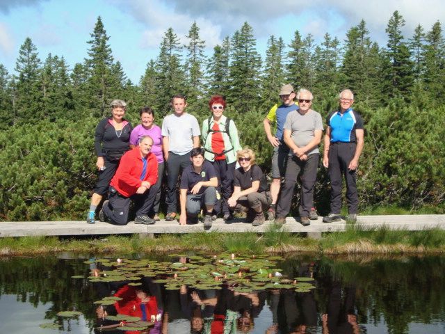 Pohorje je predalpsko hribovje, ki leži na severovzhodnem delu Slovenije. Na vzhodu ga omejuje Dravsko polje, na severu Dravska in na zahodu Mislinjska dolina. Tu najdemo različne rastlinske vrste in Rajko nam je postregel z obilico znanja o drevesnih vrstah, avtohtonih za Pohorje. Občudovali smo planje, travnata območja in, na našo srečo in zaradi Rajkovega dobrega očesa, opazili tudi mesojedo okroglolistno rosiko. Pravzaprav so nas vso pot spremljale zdravilne rože ter razni plodovi. Borovnice smo nabirali pod Kremžarjevim vrhom, cvetovom brusnic pa smo sledili že od Planinke. Tudi gobarji so dobili nekaj za pokušino. Vojko, Sonja in Lojze so ob pogledu na lisičke pozabili na markacije in pot, ki je bila še pred nami. Ni manjkalo arnike, svišča, rumene lakote idr. Ob zeliščih so izkušnje delili tudi Marjetka, Bojan in Štefka. Z Marjano sva pridno poslušali, se učili in obujali spomine na prehojene poti. Koliko jih je bilo! Lepih, nepozabnih, umeščenih v spomine srca!