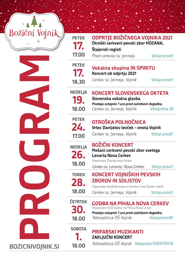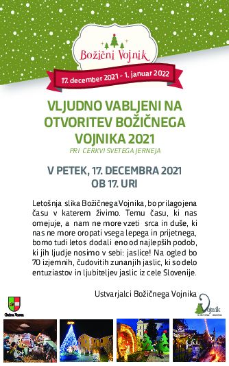 Ustvarjalci Božičnega Vojnika vas vabijo na odprtje tradicionalnega Božičnega Vojnika, ki bo danes, 17. decembra 2021, ob 17.00 uri pred cerkvijo sv. Jerneja v Vojniku.