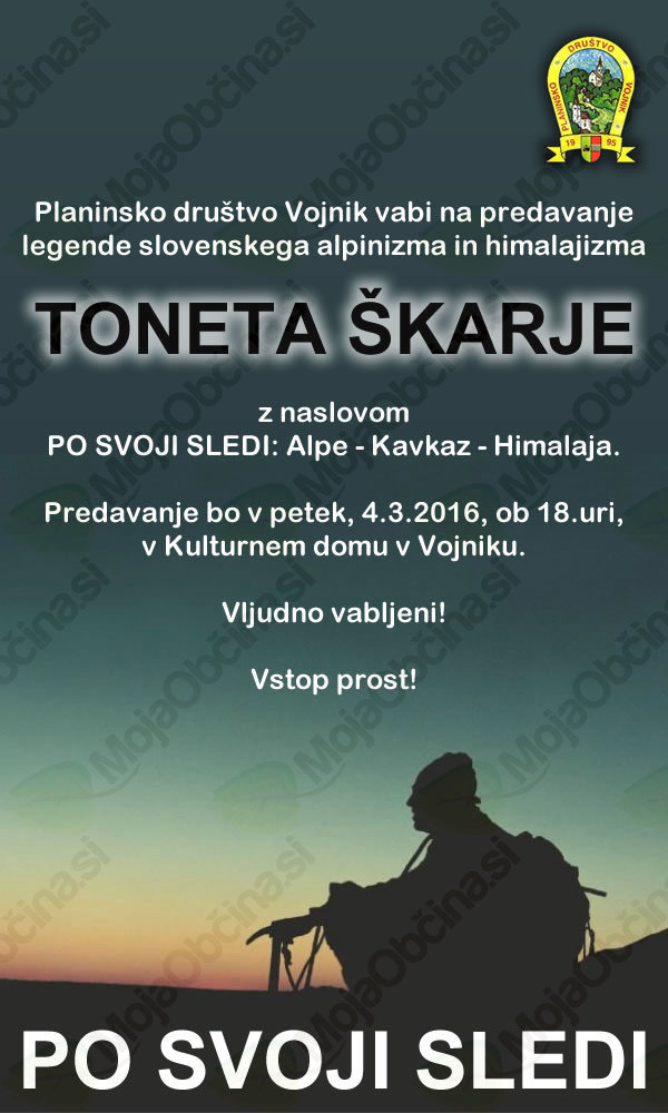 Planinsko društvo Vojnik vabi na predavanje legende slovenskega alpinizma in himalajizma Toneta Škarje z naslovom Po svoji sledi: Alpe – Kavkaz – Himalaja. Predavanje bo v petek, 4. marca 2016, ob 18. uri v Kulturnem domu v Vojniku.