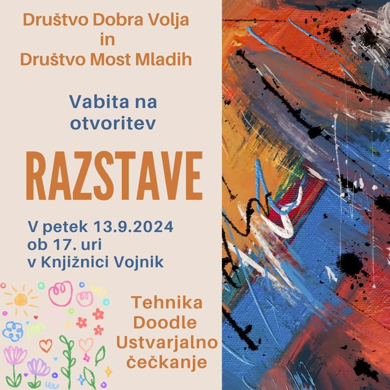 Člani društev Dobra volja in Most mladih smo v sodelovanju pripravili razstavo v Knjižnici Vojnik. Odprtje razstave je bilo v petek, 13. septembra 2024, ob 17. uri. Z veseljem se je povabilu odzval tudi župan Branko Petre. Predsednica Društva Most mladih, Simona Matko Počivalšek, nas je povabila k ustvarjanju. Člani Društva Dobra volja se radi družimo ter ustvarjamo in zato smo se z veseljem odzvali povabilu. Že maja smo se zbrali na prvi delavnici, kjer nam je ga. Simona predstavila tehniko doodle ustvarjalno čečkanje. Priskrbela nam je papir, svinčnike, barvice in flomastre.