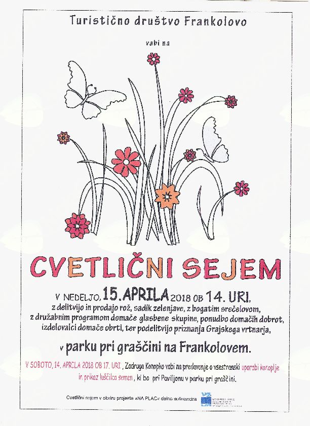 Vabljeni na cvetlični sejem v parku pri graščini na Frankolovem, kjer vsako leto delimo po eno rožico za vsako gospodinjstvo in za vsakega člana društva. Imeli bomo tudi bogat srečelov, nagradne igre, žrebali bomo enega izmed članov, ki je že plačal članarino, ki bo domov odnesel cel plato rož, lahko boste poravnali članarine, kupili rože in različne sadike sadja, zelenjave. Več kot deset razstavljavcev vam bo nudilo domače dobrote, pridelke, izdelke, ročna dela, sveže pečene »štraube« in še kaj se bo našlo.