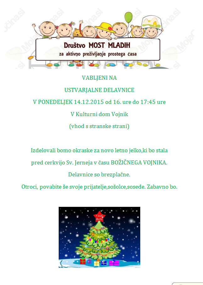 Društvo Most mladih vabi na decembrske aktivnosti, ki so jih pripravili za vas. Pomagajte ustvariti praznično vzdušje v Vojniku in izdelajte nekaj okraskov.