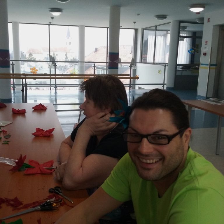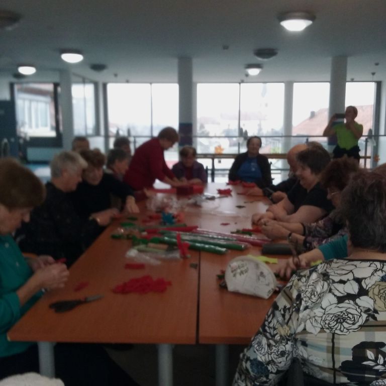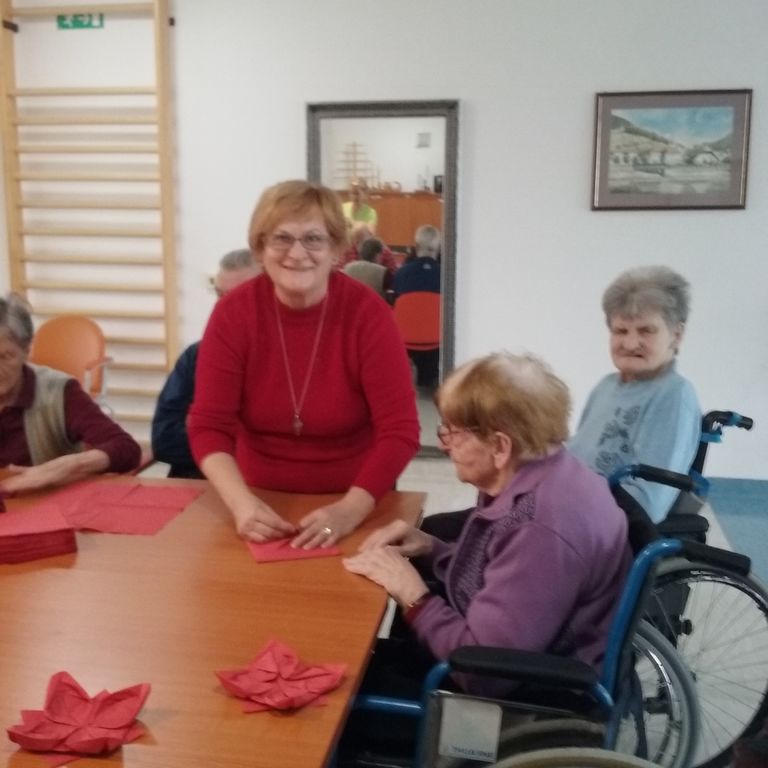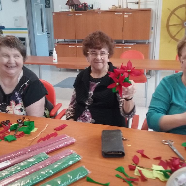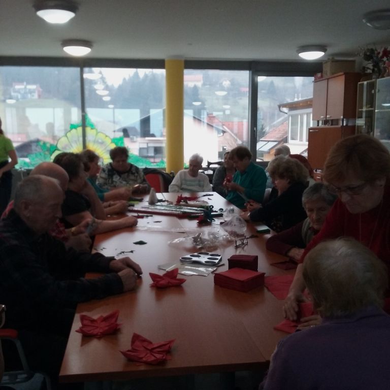 Upokojenke Društva upokojencev Vojnik smo skupaj s stanovalci Špesovega doma dopoldan iz kreppapirja izdelovali božične zvezde. Za mizo je naenkrat zmanjkalo prostora, vsi so želeli pomagati. Postalo je veselo, razpoloženje je bilo izvrstno. Kislo vreme nas ni ustavilo in motilo pri ustvarjanju. Nekatere gospe so pred leti že izdelovale papirnate rože, kot so vrtnice, nageljni, božičnih zvezd pa še ne. Pripravili smo tudi čudovite pogrinjke iz prtičkov. Narejeno je bilo veliko šopkov in pogrinjkov, z veseljem so jih odnesli v svoje sobe in z njimi razveselili še druge sostanovalce.