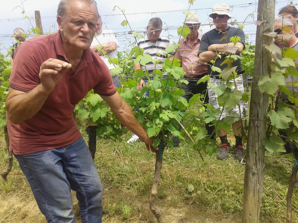 Sledil je praktični prikaz zelenih del v vinogradu gospoda Marka Vozliča. Zakaj obdržati kakšno mladiko in katero odstraniti, je pospremil s takojšnjim izračunom povprečnega pridelka. Tudi sorta igra pomembno vlogo. Posebej je poudaril dobro zračnost v vinogradu.