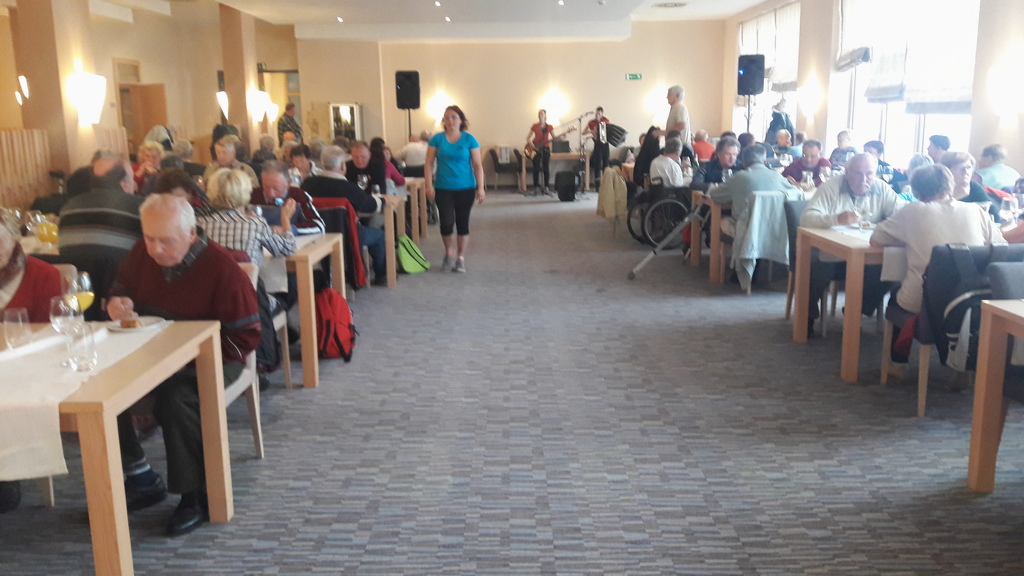Jutro se je že prebujalo, ko smo se začeli zbirati ob vznožju žičnice, ki vozi na Golte. Spraševali smo se, kako bi bil marsikdo prikrajšan za druženje, če ne bi gospod Tone Gračner imel pri delu z invalidi toliko prakse in posluha. Pomislil je tudi na tiste najtežje, ki so odvisni od vozička ali bergel. Spremljevalci so z veseljem pomagali, da so se vsi namestili v gondolo. Vodja hotela nas je pozdravil z dobrodošlico in zajtrkom. Z lepo narodno-zabavno glasbo nas je sprejel, duo Opala, ki ga sestavljata dve mladi sestri. In že smo slišali petje najbolj dobrovoljnih invalidov.