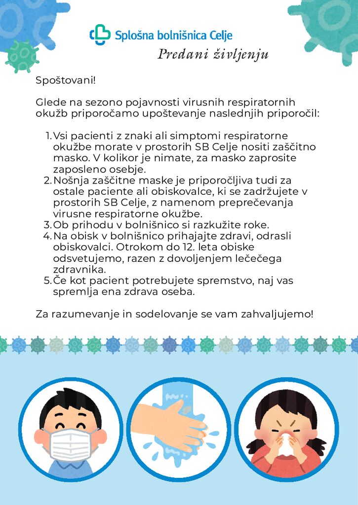 V Službi za preprečevanje in obvladovanje bolnišničnih okužb smo pripravili priporočila, ki vam jih pošiljam v prilogi in z upoštevanjem katerih bomo skupaj poskrbeli za zdravje in varnost vseh nas.