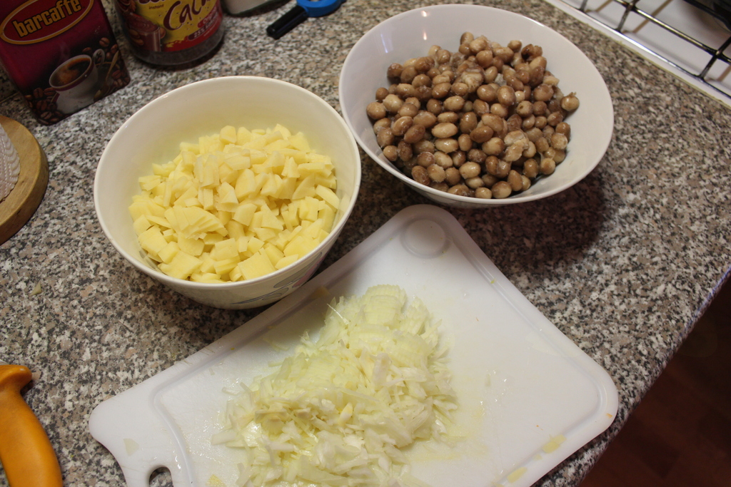 - drobno narezana zelenjava (1 čebula, 3 do 4 zrna česna,2 rumena in 2 rdeča korenja, gomolj zelene in peteršilja, zelen peteršilj, paradižnik, 6 krompirjev, por)